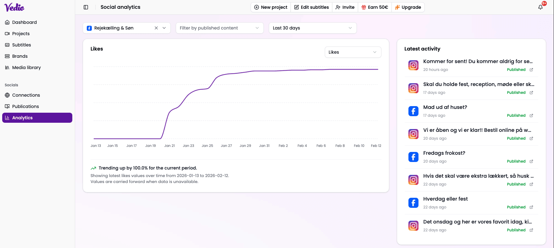 Del dem direkte til dine sociale medier via platformen ved at forbinde dine kanaler. Samtidig får du løbende adgang til performance-data, så du kan følge med i, hvilke videoer der performer bedst - og hvorfor.