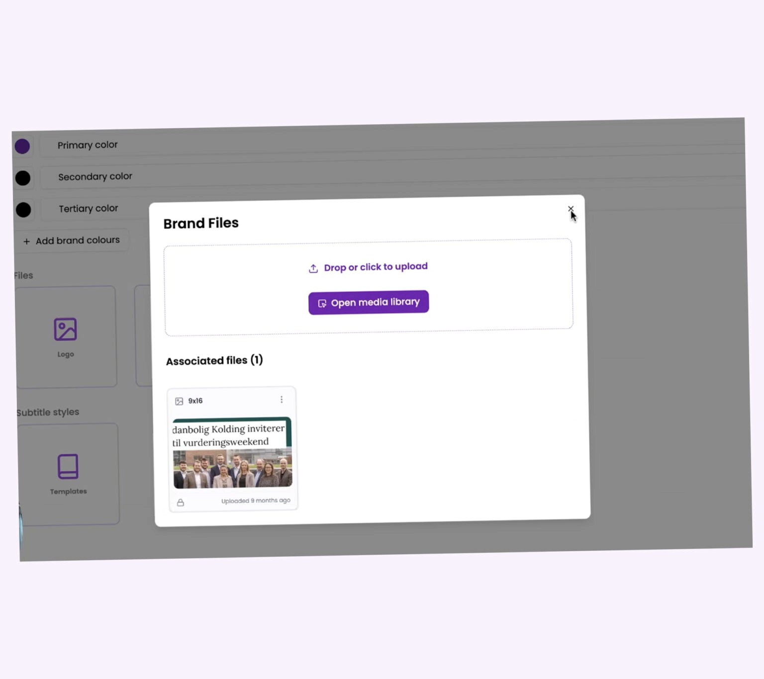 Opsæt genbrugelige video- og undertekst-templates med jeres logo, farver og typografi.