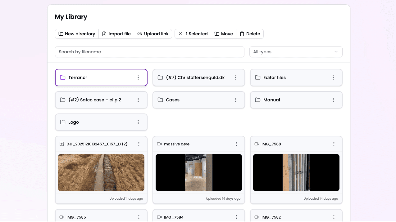 Alt samlet ét sted: råmateriale, færdige videoer, brand assets, og musik. Jeres kunder kan uploade direkte til jer. Organiseret per brand, søgbart, og tilgængeligt for hele teamet.